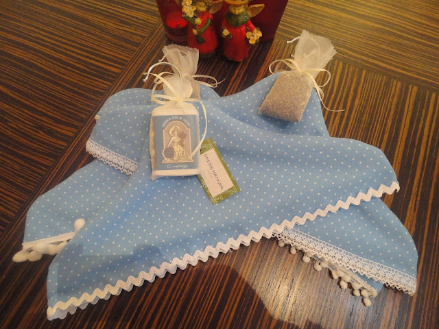 Mais um presente de Natal. Como podem ver, o tema este ano foi o "quarto". Para os restantes presentes, direcionados aos familiares e amigos pensei em cabides vestidos. Chamei-lhe DRESS HUNGER, em três versões diferentes: income, pompon e tatting, de acordo com os adornos escolhidos para cada um. O tecido escolhido foi um algudão em azul céu com pintas brancas. Para o forro a opção caíu num tecido de algodão em branco neve.